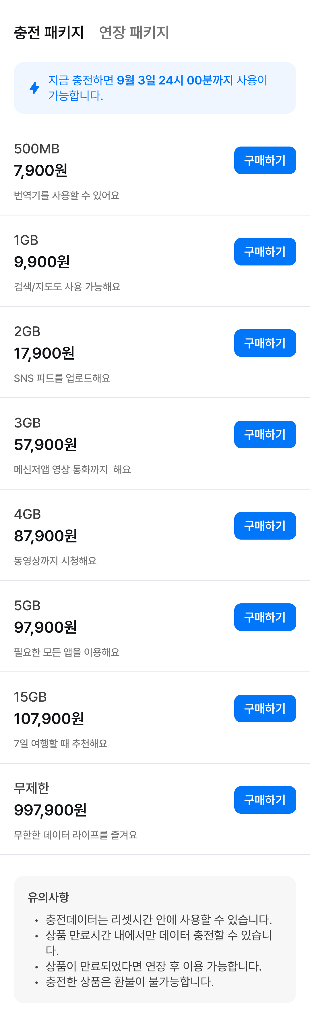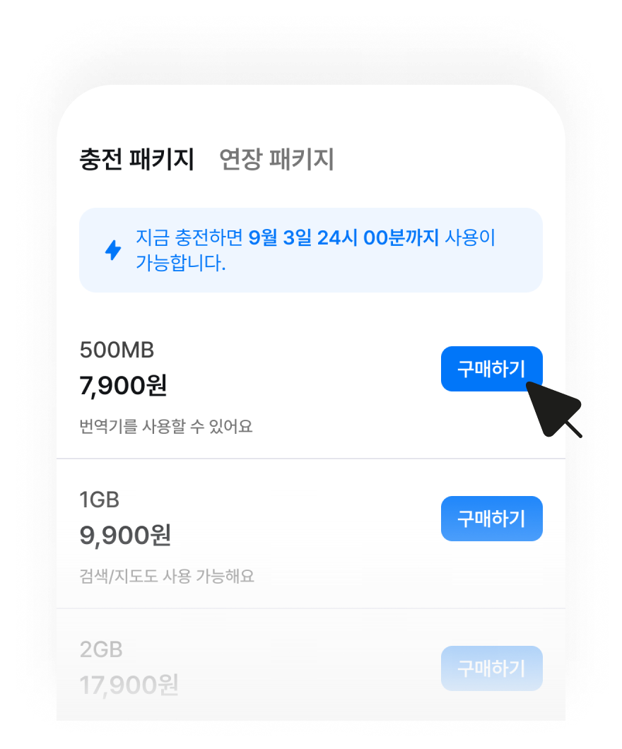 데이터를 다 써도 연결은 계속돼야 하니까요.앱에서 바로 사용량을 확인하고 손쉽게 충전할 수 있어요.여정의 끝까지, 안정적인 네트워크를 함께 이어갈게요.